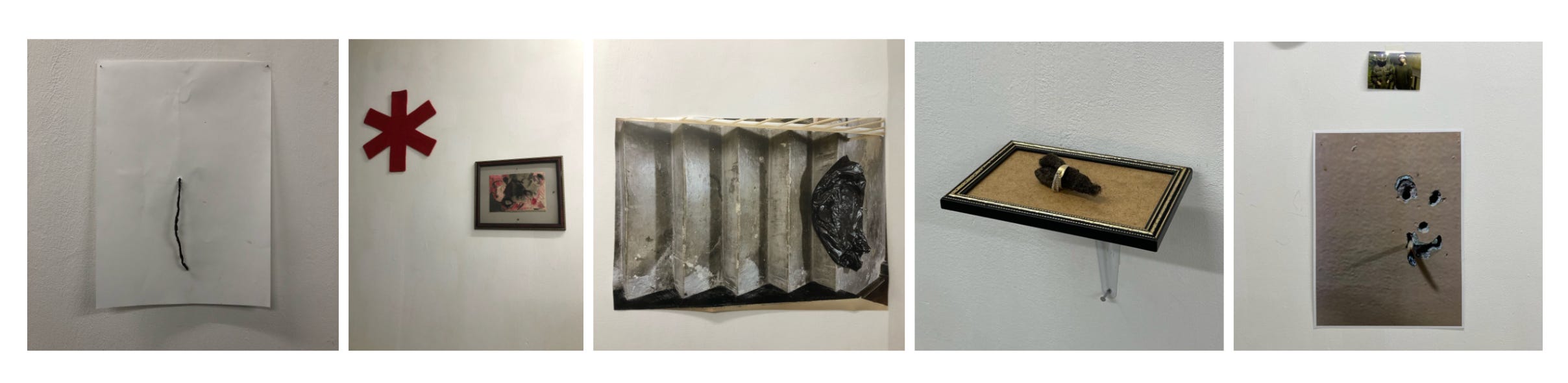 The only painting in Emmanuel Shogbolu’s exhibition is titled Now or Never. Small in scale, and mounted in an outdated frame (by contemporary gallery standards), the work combines inky black abstraction with harsh red lines that function like ominous doodles in a dramatic vista. The show, titled Pieces of a Scattsman, is an immersive exhibition, combining metaphorical conceptual tools employed by the likes of David Hammons and Rhea Dillon with an intuitive form of photographic display that we might liken to Wolfgang Tillmans (see his diaristic show at Morena di Luna back in 2021). Autobiographical, Pieces of a Scattsman explores Shogbolu’s viewpoint of the mid-2000s in the London Borough of Newham. An early newspaper clipping describes a ‘Family Forced To Flee After Chair Ignites’; reading the text one realises that the 18-month-old was, in fact, the artist who escaped alongside his mother and sibling when an armchair in their home was set alight by a gas fire. Hung amongst images of the artist’s friends and closeups of pedestrian scenery given a beautifully close inspection, the show paints an intimate portrayal of the artist’s life and community. One photograph of a concrete stairway, rotated 90 degrees on the wall to become almost abstract, shows a bin liner at the top of the steps. What appears like trash is, in fact, a makeshift seat a friend would place on the stairs to avoid a wet – and presumably cold – bum. The video projected onto the wall is satisfyingly deceitful. What looks like found footage of a pavement fight turns out to be rapper Dizzee Rascal playfighting, with loud accompanying music adding to the general vibe. A standout work is a piece of the artist’s hair placed on a gilded frame that is inverted to function as a plinth. The artist’s favourite gold and diamond ring – removed from daily use for the length of the exhibition – is worn on the lock of hair like it is a finger. Shogbolu picks up the piece and explains that it can be seen as an image juxtaposing spirituality and materialism. Hung next on the wall is a single part of the artist’s dreads, stuck through the middle of a simple white sheet of paper. It is a strangely moving object, and Shogbolu explains the covenant he has with himself: he only cuts his hair once he has achieved one of his goals (writing a book, travelling, health, fitness, *opening an exhibition*). It’s now or never.