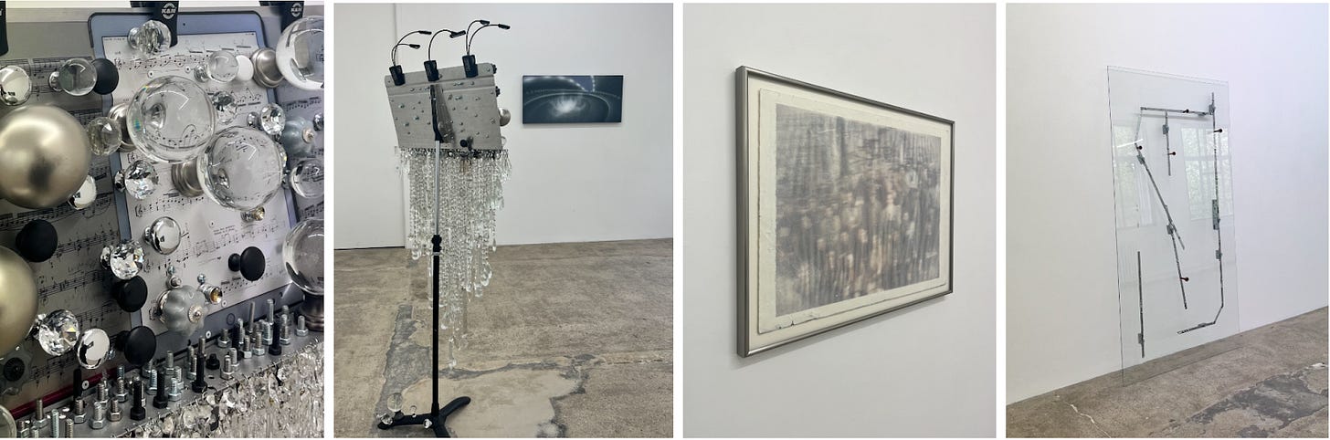 Festooned with crystal trimmings, a music stand draws us into the centre of Rose Easton’s bright gallery space. Door knobs, tens of them, are screwed into the metal surface of the stand. Sprouting across the feet and front, the knobs skewer sheet music into place over a bed of exposed nuts and bolts, from which the dangling chandelier prisms threaten to topple the whole thing over. This work by Scott Keightley is giving wind chimes x crystal ball, but delivered with intense corporate formality and a touch of sadomasochism.